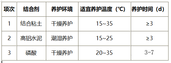 16)、耐火澆注料在施工后,應按設計規定的方法養護。如無特殊規定,可按表的規定進行。耐火澆注料養護期間,不得受外力及振動。蒸汽養護的升溫速度,宜為10~15℃/h,降溫速度不宜超過40℃/h。