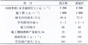 以產量5 000 t的四代篦冷機來說,替換使用預制件的部位澆注料用量按80 t計,每噸澆注料大約要用0.023 t的0Cr25Ni20耐熱鋼錨固釘。耐熱鋼錨固釘單價若按5萬元·t-1計算,則在篦冷機上使用澆注料與預制件的比較結果見表1。