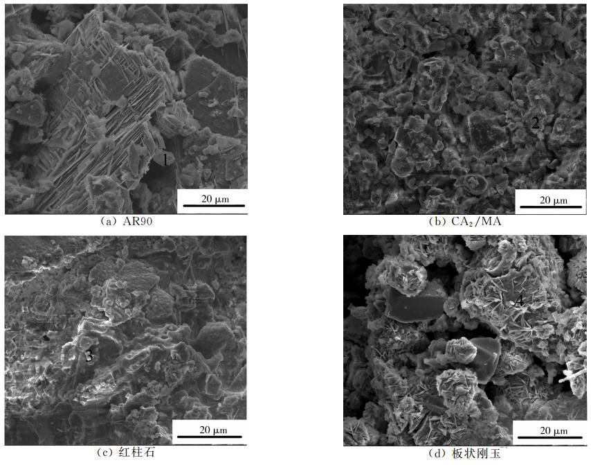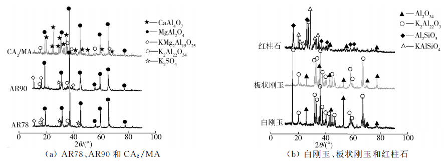 ()AR90、AR78和CA2/MA與堿鹽反應后生成少量的低密度鉀β-Al2O3(K2O·11Al2O3)和KMg2Al15O25,所引起的體積膨脹較小,線變化率滿足-2%~2%耐堿腐蝕標準。