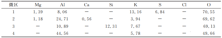 1300℃×5h條件下不同試樣與堿鹽反應后的SEM照片如圖3所示,圖3中各微區成分如表3所示。由圖3及表3可知,AR90與堿鹽反應極少,尖晶石形貌結構較完整,成臺階狀分布,殘留的成塊狀團聚的K2SO4分散于尖晶石表面。從圖3(b)可看出,球狀CA2晶粒細小,晶粒呈團簇狀分布于MA晶間,在CA2及MA表面均有一種針狀物質存在,通過表3分析,該針狀物質是CA2/MA與堿鹽反應后生成的鉀β-Al2O3(K2O·11Al2O3)。由圖3(c)可知,紅柱石的晶形呈放射狀集合體,結構疏松,放射狀集合體被大量亮白色的物質隔斷,結合表3分析,亮白色的物質是紅柱石與堿鹽反應生成的KAlSiO4。由圖3(d)及表3可知,剛玉與堿鹽發生反應后生成了大量的鉀β-Al2O3,板狀剛玉晶粒被厚厚一層針狀的β-Al2O3所包裹,剛玉幾乎被堿腐蝕盡。