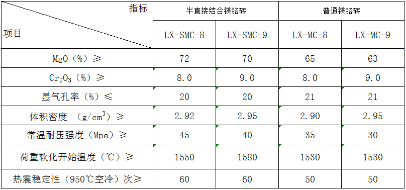 半直接結合鎂鉻磚、普通鎂鉻磚:此兩種產品均是以高純度鎂砂和鉻礦為主要原料,并按一定比例經混合、成型、高溫燒制而成。具有強度高、高溫性能適中、熱震穩定性好等特點。主要是用于水泥窯、銅冶煉等熱工設備。