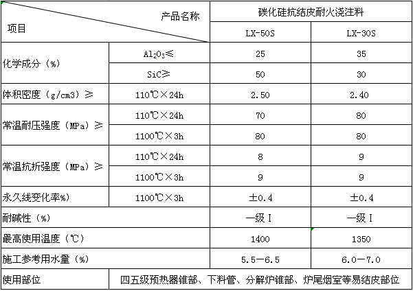 適用于大中型新型干法水泥窯預熱器下料斜坡、上升煙道、分解爐錐體,煙室,四、五級預熱器錐段、下料管等易結(jié)皮部位。碳化硅抗結(jié)皮澆注料主要以碳化硅為主要原料,添加高效減水劑與超微粉,以純鋁酸鈣水泥做結(jié)合劑,可以大幅度降低結(jié)皮次數(shù)。